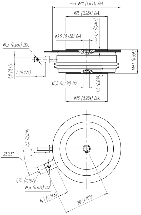 Тиристоры Т223 - таблеточные тиристоры общего назначения, регулируют и преобразовывают постоянный и переменный ток до 590А частотой до 500Гц в цепях с напряжением 100В - 3200В.